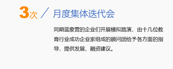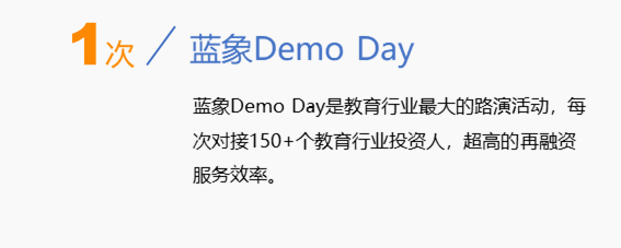 藍象資本是專注教育領(lǐng)域的早期基金,項目按照1000萬元估值投資30或80萬元。每年2期“藍象營”加速計劃,每期持續(xù)6個月。